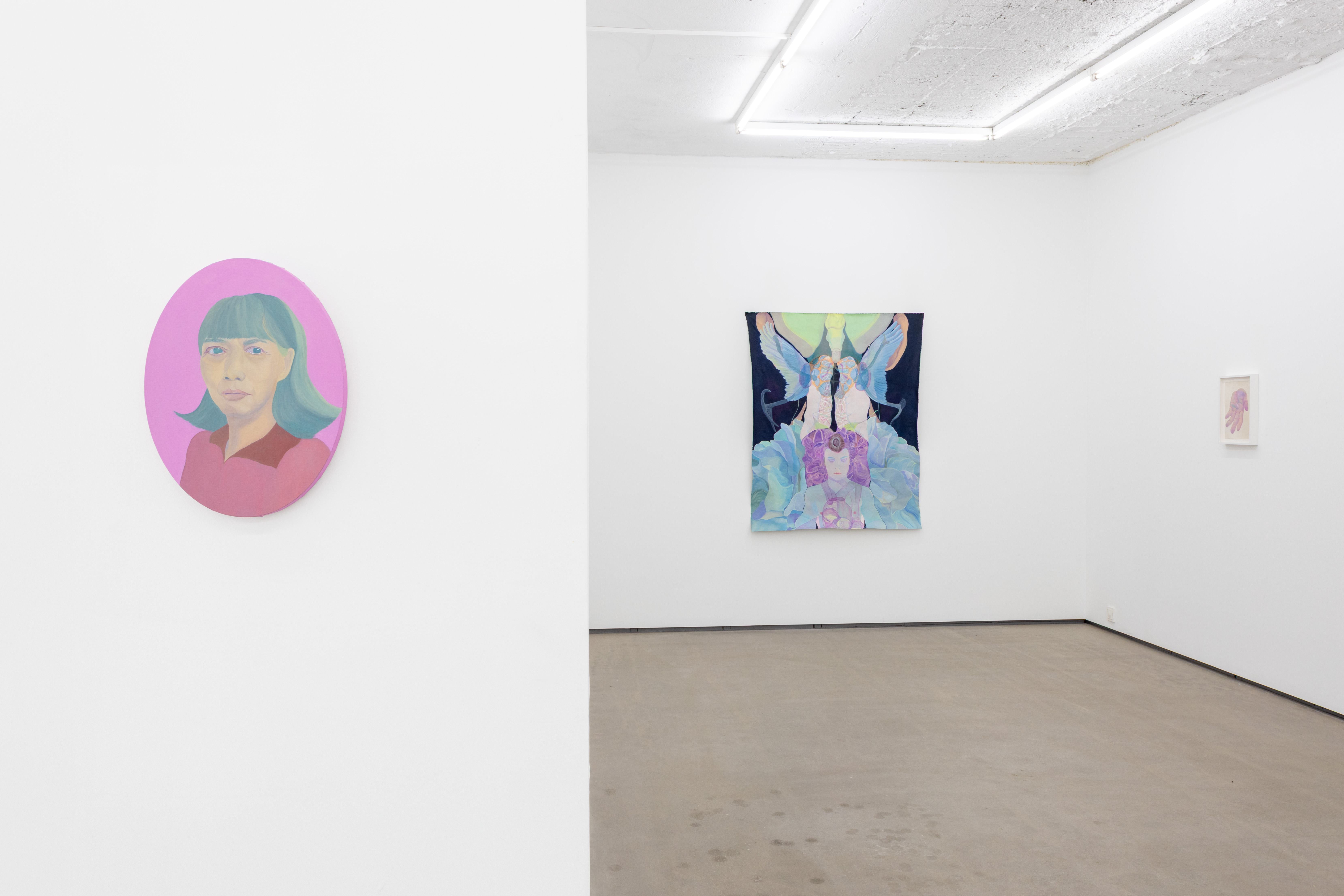 Chen's paintings here are primarily in smaller formats, asking for intimate viewing. He also works with a colour palette that suggests its subjects are lit in an otherworldly light, as in A Dream Within a Dream. Here, rendered in blue, purple and pink tones is a large glowing egg held above a figure's penis, against their abdomen. In Farewell, two disembodied hands hook thumbs like a bird flapping its wings (or are they hands waving farewell?). In Emergence Failure, an outstretched hand holds an egg that failed to hatch, a life cycle unfulfilled. In a room full of vulnerable glands and visceral imagery, an oval canvas portraying a hand holding a glinting steel cleaver.